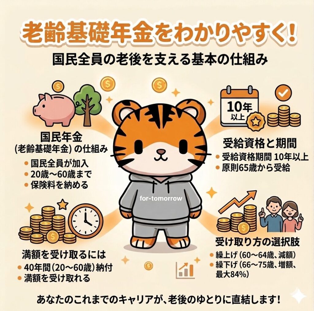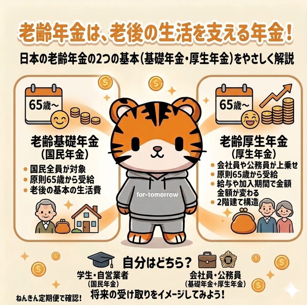 かわいいトラのキャラクターが、日本の老齢年金制度の基本について分かりやすく説明しています。 お金