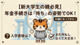 かわいいトラのキャラクターが、日本の老齢年金制度の基本について分かりやすく説明しています。 お金